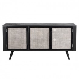 This low profile TV stand is a storage piece that every living room deserves. The wide-stretching two-drawer design, with an open shelf in between, provides ample storage for all of your entertainment needs. A cord cut-out is in place for ease of connect-ability. The black water-based paint lightly reveals the rustic texture of the underlying wood. Handwoven split rattan drawer fronts add a natural and unstructured look to each piece.