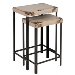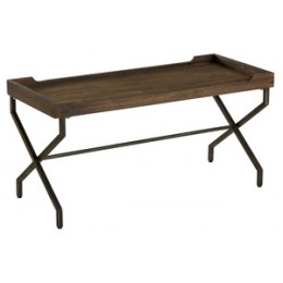 The industrial chic Cooper Classics Davey Tray End Table takes entertaining to the next level. This end table features a removable round tray top with grommet holes and sturdy handles. It stands on a delicate yet strong galvanized metal frame with X stretcher. A blackened galvanized finish on this end table is accented with touches of bronze.