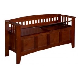 Keep your mud room or entryway neat and tidy with this beautiful and unique hall tree with storage bench. Spacious seating area flips up to reveal a large storage section. The bench features a split seat, allowing the user to rest on one side of the bench, while retrieving articles from the storage compartment on the opposite side. A back panel with four hooks is perfect for hats and coats. Rich "walnut" finish will compliment virtually any decor. This hall tree will provide function and style to any room.