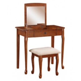 Add simple yet elegant furniture to your bedroom or dressing area with the Molly Vanity Set. The vanity comes with an attached mirror and plush upholstered coordinating bench for the utmost functionality. Straight simple lines are accented by thin traditional styled carvings around the edges. A single drawer provides space for storing jewelry, makeup and personal items. The rich cherry finish will complement an array of decor colors. Crafted from solid materials, this set is sturdy and strong. Some Assembly Required.