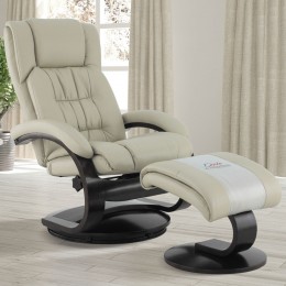 Total adjustment to the multiple position recline create a Òstop anywhereÓ approach to find that personalized comfort level. Easy twist knob control makes the tension adjustment a mere turn of the handle. During the recline movement of the back our seat level will also elevate to bring the proper position for leg and lower back support. This has many advantages to include the positive position of blood circulation. Great for personal adjustments to the individuals that vary from short to tall. All seating is complimented by the sister items; matching ottomans that are styled with an angle for not only appearance but support. The lower position of the feet to the knees helps assist in the proper seating required for body wellness. Selected models in our ÒSignature SeriesÓ also include the adjustment of the upper headrest by articulation, which proves self movement as the lower back and seat move. This will allow for another positive position as a great feature for the long times spent in Home Theater. Full 360 degree swivel adds versatility to place the models in most locations in the home and as to the easy entrance and exit around the matching ottoman. Note this is great for communication with others that may not be positioned directly across from the occupant.