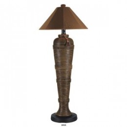 Add casual elegant styling to your outdoor living area. Features all resin construction with a heavy weighted copper and brushed silver base. Completely weatherproof with a black Sunbrella shade cover, two level dimming switch and a 12 ft. cord. Unbreakable poly-carbonate waterproof light bulb enclosure allows the use of a standard 100 watt light bulb. Made in USA.