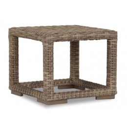 Its powder coated aluminum frame is expertly wrapped with premium all-weather wicker in a rich Aged Tobacco finish. Deep seating and table bases are protected by brushed aluminum feet. Weather resistant, high-resilient density cushions are enveloped in quick ship fabric Sunbrella™ Canvas Flax.