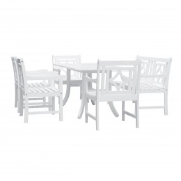 Enjoy your dinner with family and friends right in your backyard on a summer evening and share the your stories! With 100% Acacia solid wood construction which is pre-treated and expertly kiln-dried, this patio dining set is suitable for both indoor and outdoor use. It quickly repels water, and its natural oil combats and repels wood eating insects. The combination of slatted and contoured seat design delivers extra comfort in both touch and postures. Its white-painted finish brings a modern and elegant look to any deck, patio, or garden.